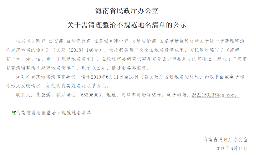 海南省民政厅发布的公示清单显示,如对不规范地名清单有异议,需于2019年6月11日至18日向省民政厅区划地名处反映。