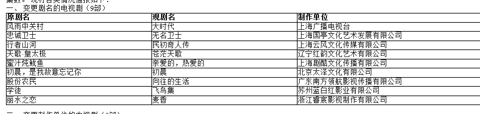 新京报讯(记者 张赫)近日,广电总局公布5月全国电视剧备案公示和变更通报,电视剧《蜜汁炖鱿鱼》《初晨,是我故意忘记你》等9部电视剧变更剧名,《九州缥缈录》《小欢喜》《鹤唳华亭》《暗恋橘生淮南》等22部剧目变更集数。