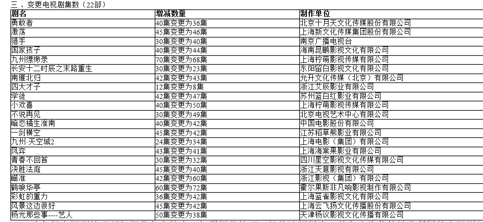 此外,除《九州缥缈录》由70集变更为68集,《长安十二时辰之末路重生》由30集变更为23集之外,大部分电视剧均增加了集数。其中,黄磊、海清主演的电视剧《小欢喜》由40集变更为50集;罗晋、李一桐主演的古装剧《鹤唳华亭》由60集变更为72集;任嘉伦、张钧甯主演的电视剧《不说再见》由30集变更为49集。
