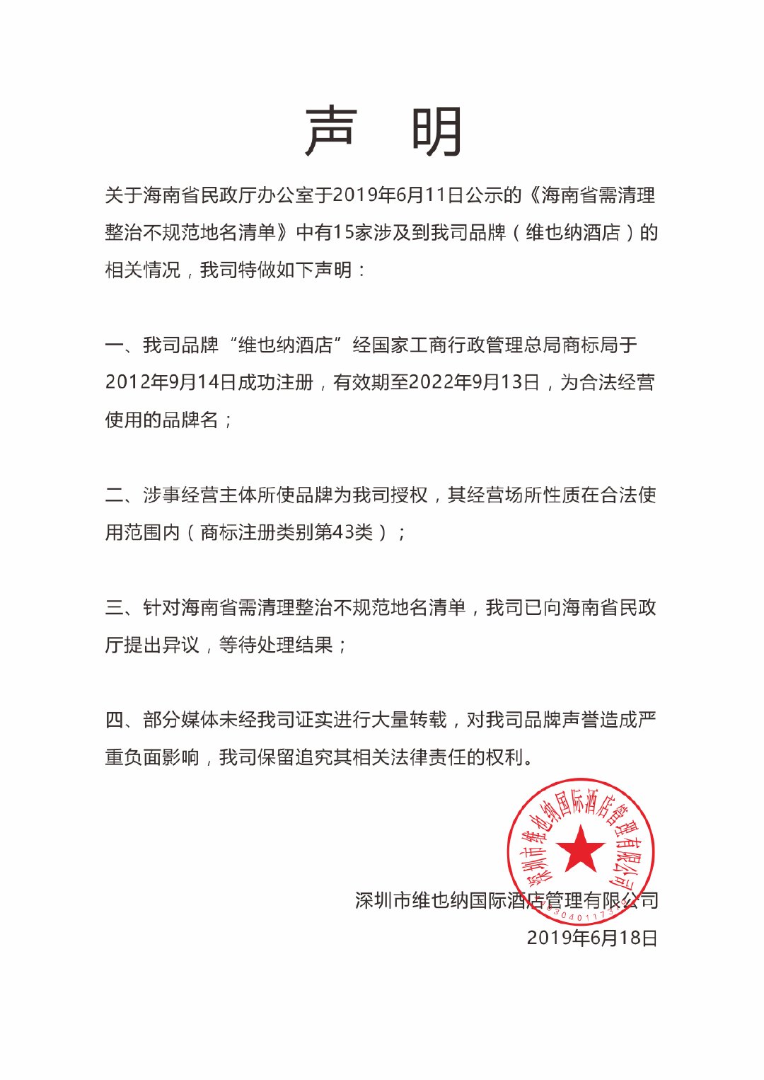 15家酒店地名不规范?维也纳酒店向海南民政厅提出异议