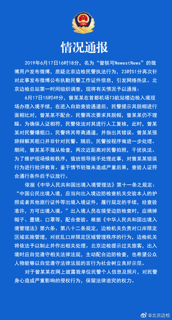 19日,北京边检就曾轶可发微博质疑北京边检民警执法行为一事发布通报。