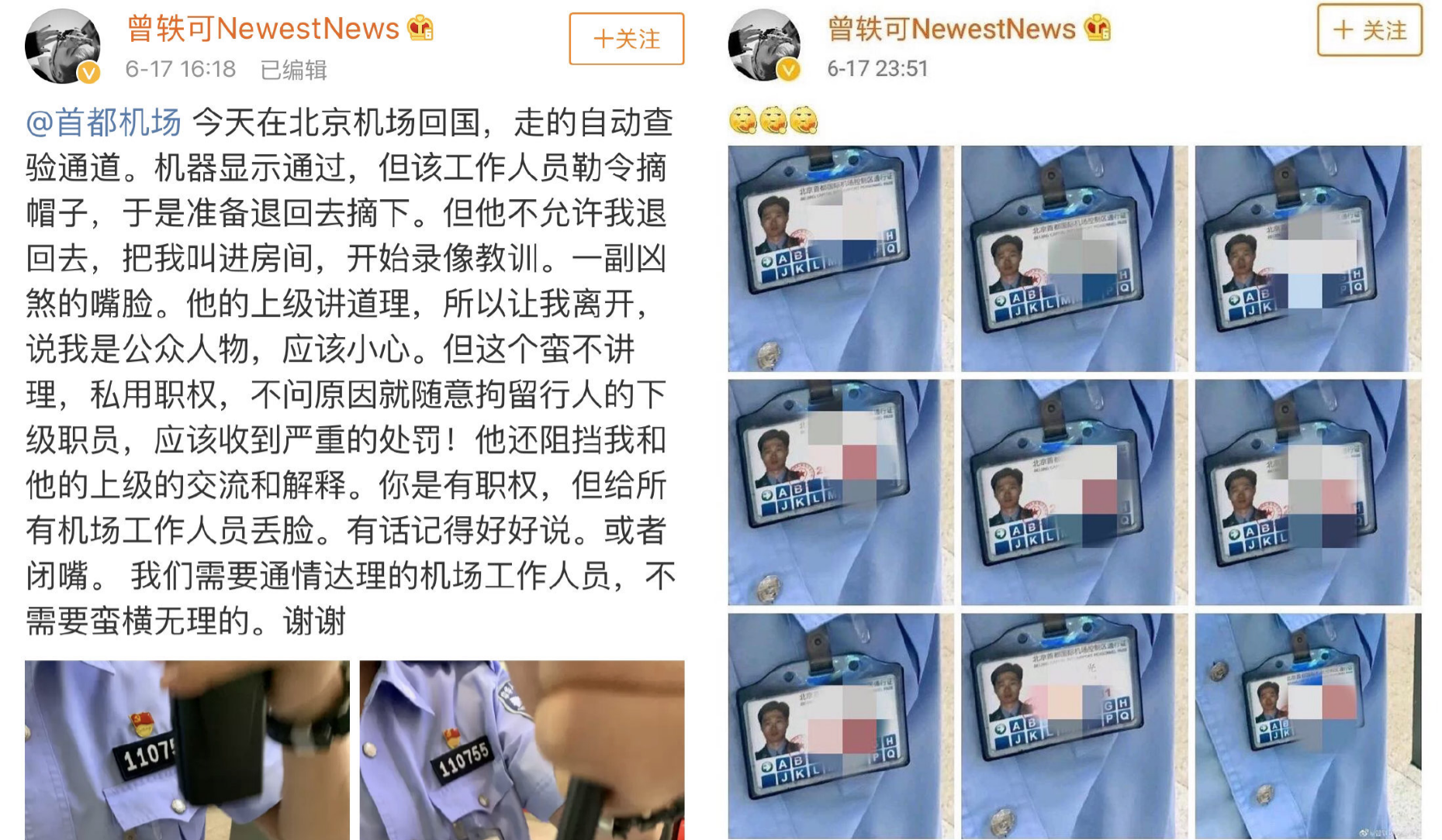 事件始于6月17日,原超女歌手曾轶可发微博称遭首都机场工作人员刁难,并发九宫格照片公开工作人员信息,引发网友热议。