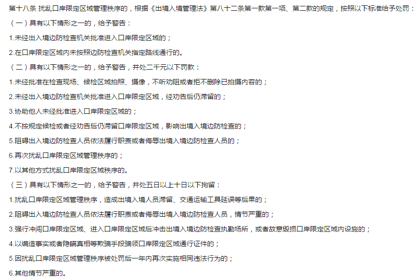 违反《中华人民共和国出境入境管理法》行为的处罚裁量基准部分内容截图