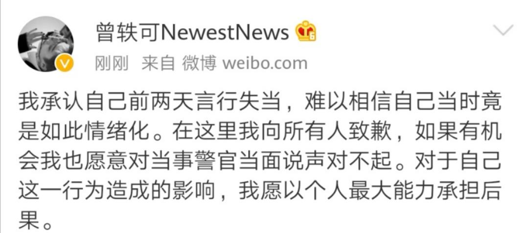 今天13时许,曾轶可在微博中道歉称,我承认自己前两天言行失当,难以相信自己当时竟是如此情绪化。在这里我向所有人致歉,如果有机会我也愿意对当事警官当面说声对不起。对于自己这一行为造成的影响,我愿以个人最大能力承担后果。