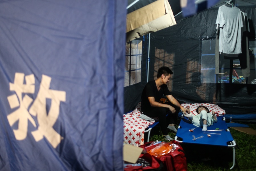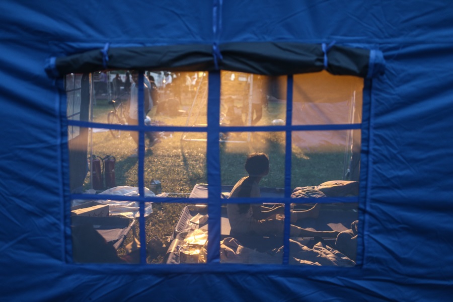 一位坐在帐篷内的小女孩。新京报记者 彭子洋 摄