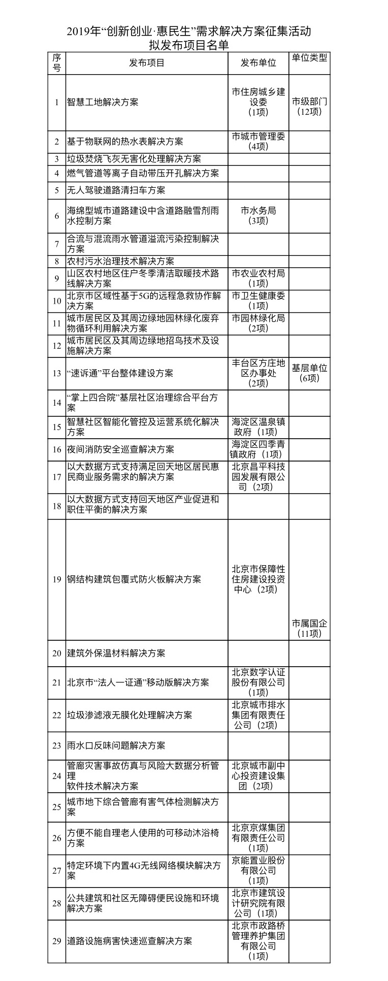 今日(6月19日)上午,2019年问计于民——“创新创业•惠民生”需求解决方案征集活动发布会召开。这是2019年全国双创活动周北京会场的特色活动,来自北京市市级部门、基层单位、市属国企的18家单位,面向全社会征集29项民生问题的解决方案,涉及公共服务、环境保护、医疗健康等领域。