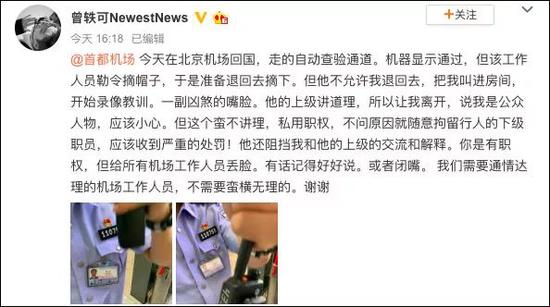 这原本是一次正常的执法行为,却被曾轶可情绪化地解读为“蛮横无理”“滥用私权”。如果曾轶可能够放低姿态,过边检时候能够按照操作要求脱帽核验,或者积极配合民警执法,都不会引发任何波澜。事情过后,曾轶可没有吸取教训,而是难咽下这口气,当晚在大号和小号连续发微博诉说自己在机场遭到工作人员的刁难,完全是一副受害者的模样;并在晚上11点发出九宫格图片,将执法民警的照片在不打码的情况下放出,引发网友争议。