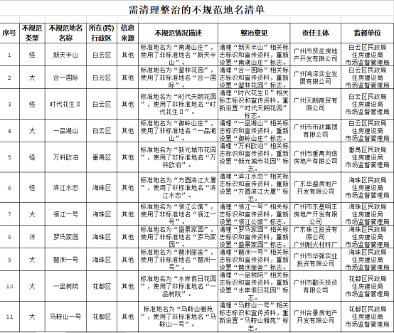 广州市需清理整治的不规范地名名单(部分)。 广东省区域地名网图
