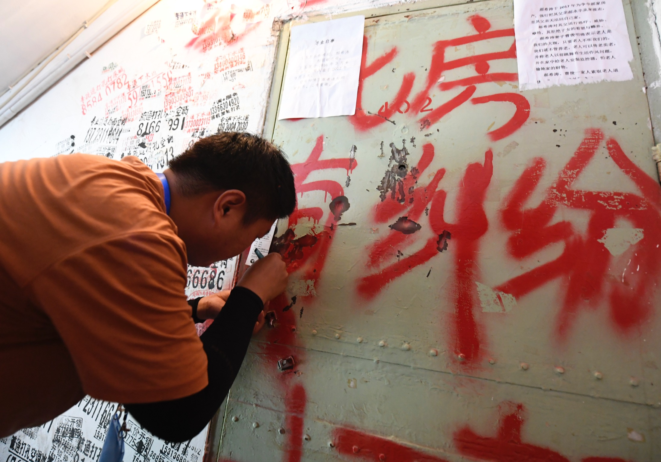 郝老汉家门上被孙子喷上红色大字。 新京报记者 吴宁 摄