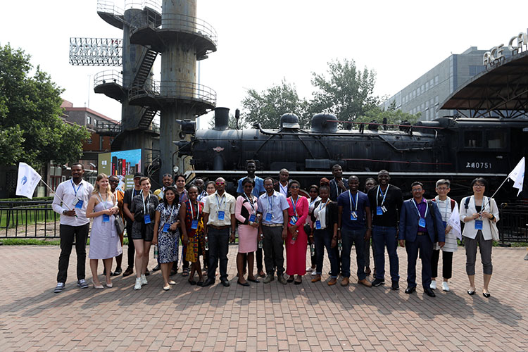 留学生来到751D·PARK时尚设计广场,这是北京市首批文化创意产业园区之一,30名留学生在751火车头广场合影。