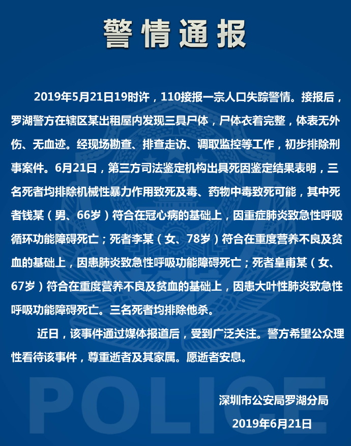 深圳警方通报“藏尸冰柜”案:3名死者排除他杀