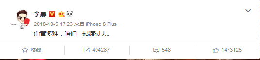 2018年10月 李晨在微博发文称:“甭管多难,咱们一起度过去。”疑似公开表态,会陪在女友身边支持她。这也是税务风波后李晨首次发声。随后李晨对此回应称,“认识错误,接受教训,积极改正。”