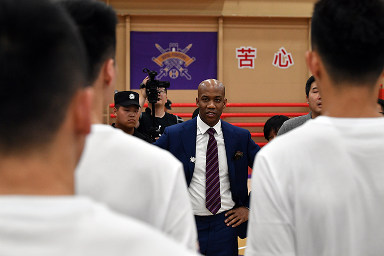 马布里在北控男篮训练场给队员们训话。