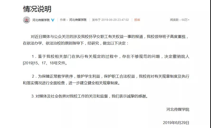 新京报报道,针对“大学女职工未报备怀孕被罚”一事,河北传媒学院6月29日晚通过官方微博表示,校方相关部门在执行有关规定的过程中存在不够规范的问题,决定撤销相关文件,将对有关规章制度及执行和落实情况进行全面检查。