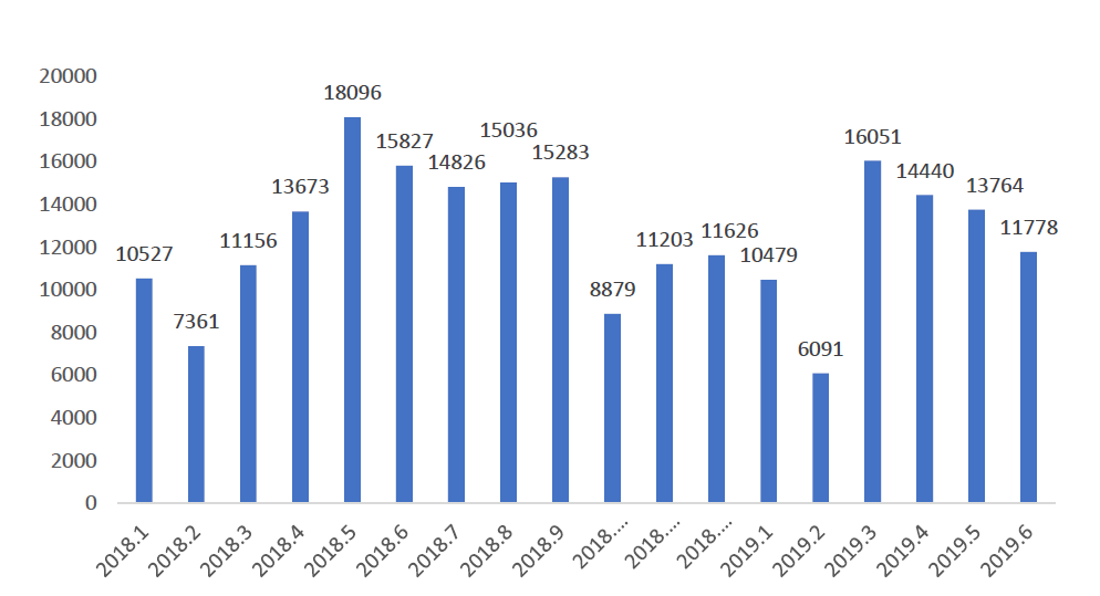 2018年-2019年北京二手住宅网签量月度走势(套)