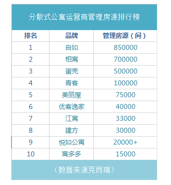 其中,自如在完成B轮融资的同时,管理房源达85万间,稳居分散式公寓运营商管理规模首位;蛋壳公寓在管房源5万间,半年度房源量增20% 。相寓、青客、美丽屋管理房源变化不大。值得一提的是,由建行及方圆集团合资设立的建方,以3万间的管理规模首次入榜。