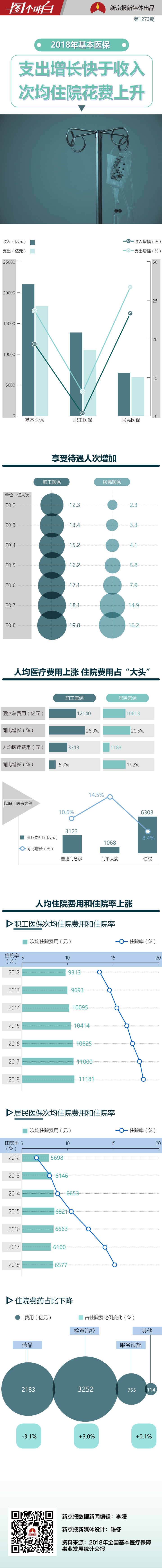 其次,人均医疗费用在上涨。公报显示,2018年职工医保参保人员人均医疗费用3313元,比上年增长5.0%;居民医保参保人员人均医疗费用1183元,比上年增长17.2%。