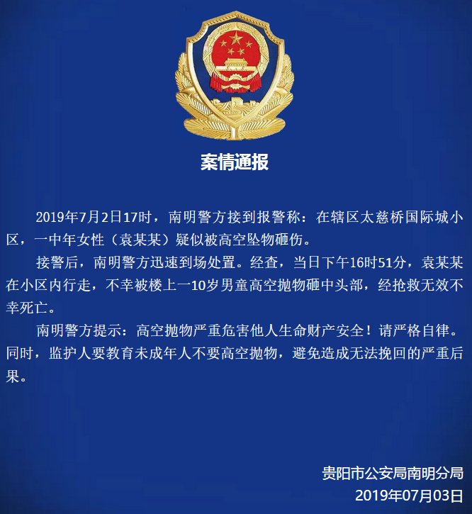新京报快讯 据贵州贵阳市公安局南明分局官方微信消息,7月3日贵阳公安南明分局通报了一起高空抛物致死案件。据悉,7月2日17时,南明警方接到报警称,一中年女性在小区内行走时,不幸被楼上一10岁男童高空抛物砸中头部,经抢救无效不幸死亡。