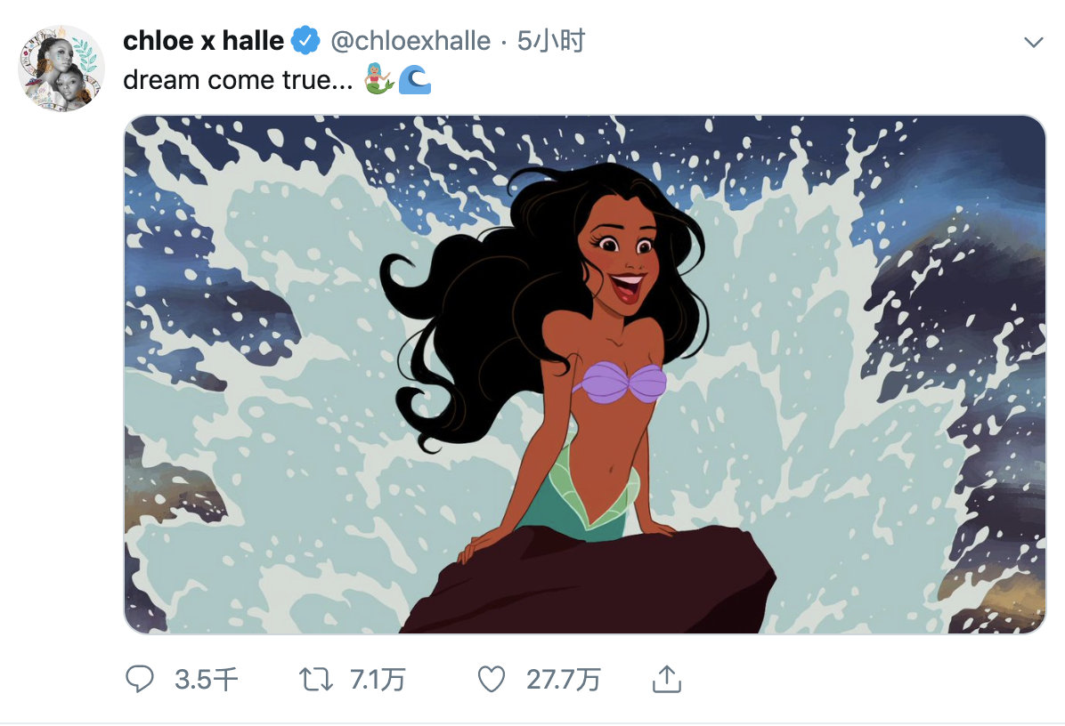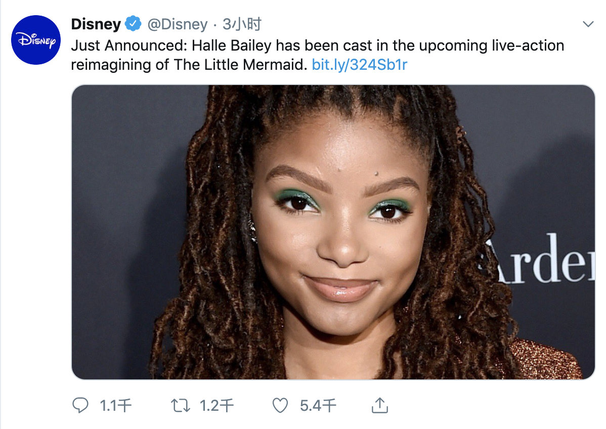 迪士尼宣布《小美人鱼》女主角为Halle Bailey。