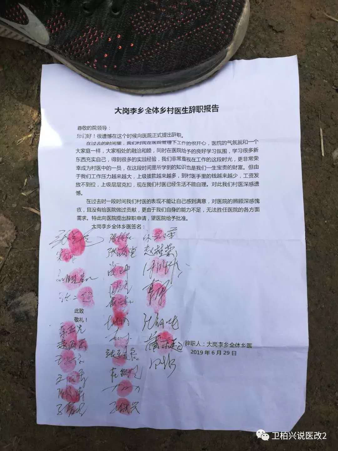 7月5日,“卫柏兴说医改2”公众号发文称,通许县朱砂镇36名村医集体辞职信在各村医群内引发关注。文中披露的摁有30余名乡村医生红指印辞职信称,由于到村医手里的钱越来越少,工资发放不到位,上级层层克扣等问题,向医院提出辞职申请。