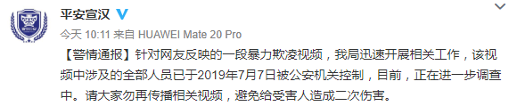 针对网友反映的一段暴力欺凌视频,我局迅速开展相关工作,该视频中涉及的全部人员已于2019年7月7日被公安机关控制,目前,正在进一步调查中。请大家勿再传播相关视频,避免给受害人造成二次伤害。