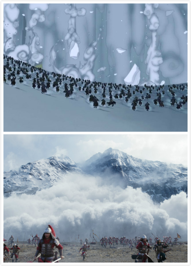 上下图分别为动画片和预告片的雪崩剧照。