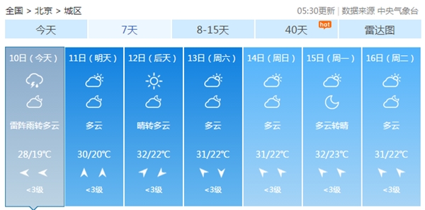 北京市气象台预计,今天白天阴有雷阵雨转多云(早晨有轻雾),东风2、3级,最高气温28℃;夜间多云,东转北风1、2级,最低气温19℃。
