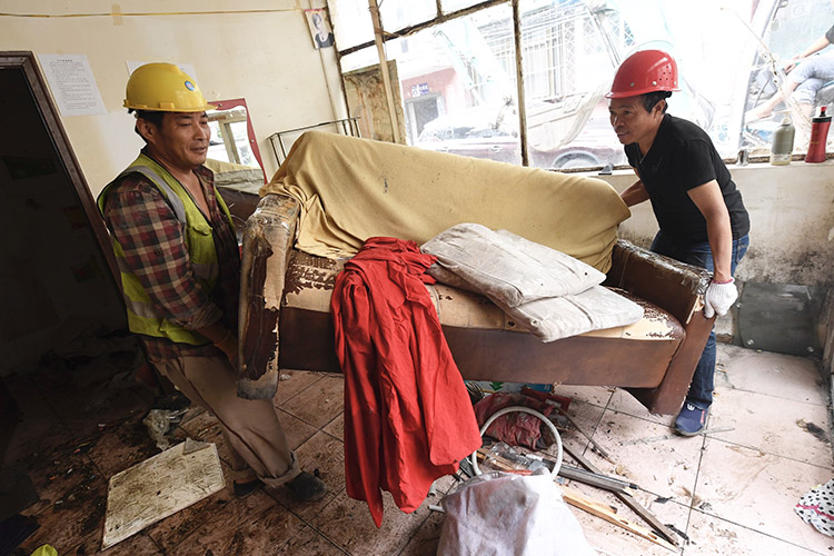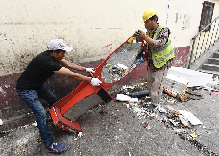 施工人员将违建房屋内的破旧家具清理。