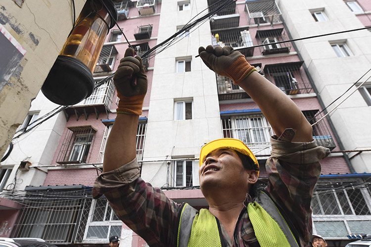 施工人员正在对违建附近的电线进行断电处理。