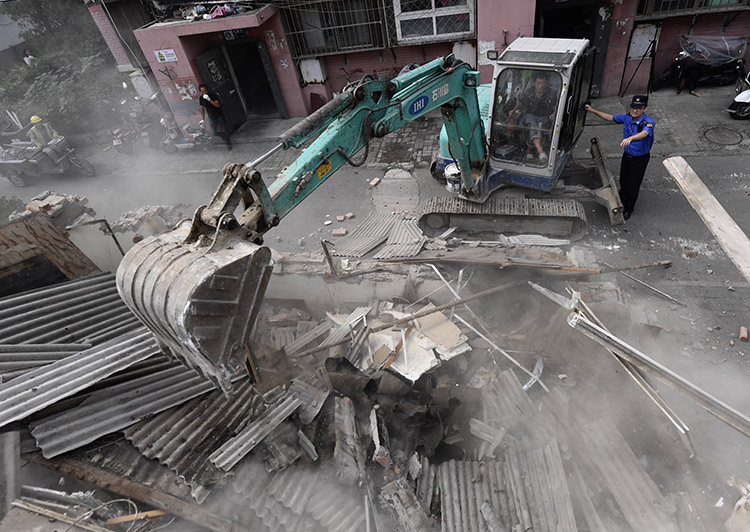城管执法队员指挥施工机械对违建房屋进行拆除。
