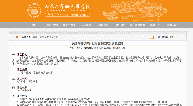 比如,今年6月,山东大学临床医学院就下发了《关于举办学伴计划第四期帮扶计划的通知》。通知表示,即将开展题为“‘相伴成长’学业帮扶共进专项”的项目,活动内容主要是“学习成绩较好帮扶挂科同学”。
