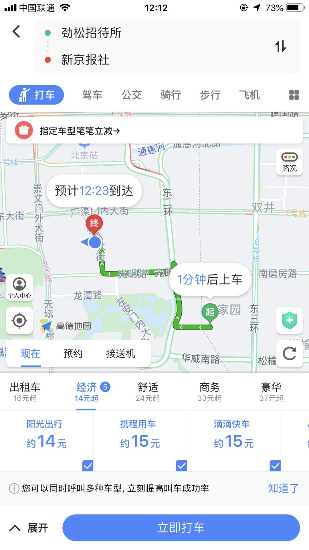 7月11日平峰时段,新京报记者从潘家园劲松招待所打车至鑫企旺写字楼(幸福大街),3.5公里左右。行程前,滴滴系统预估16.1元,高德地图各出行平台预估价格分别为,出租车16元、阳光出行约14元、滴滴快车约14元、携程用车约16元、AA出行约18元、曹操新能源优惠5元后约20元、神州专车优惠6元约22元、曹操专车优惠6元后约25元、首汽约车优惠3元后约26元、礼橙专车约40元。行程结束后,滴滴快车实际结付14.45元;与调价前该行程13-14元相比,费用基本持平。