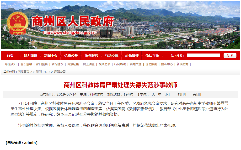商州通报“女生遭老师长期辱骂”:情况属实 将严肃处理