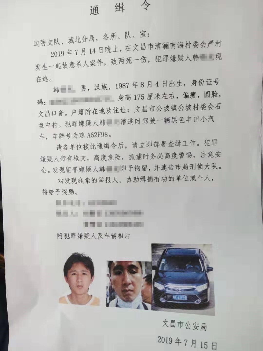 2019年7月14日晚上,在文昌市清澜南海村委会严村发生一起故意杀人案件,致两死一伤,犯罪嫌疑人韩某某现在逃。