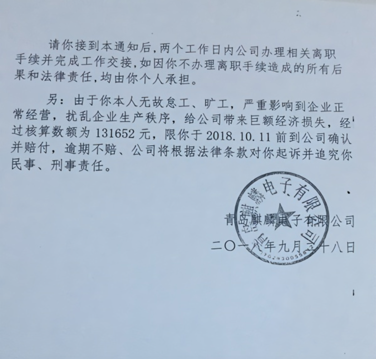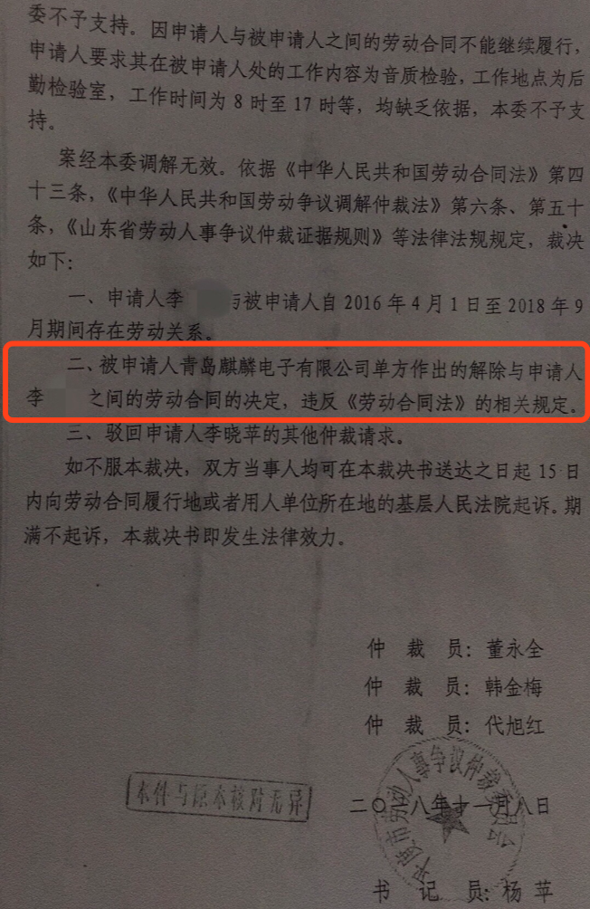 此案经劳动仲裁委“调解无效”。2018年11月8日,平度市劳动人事争议仲裁委员会出具裁决认定,青岛麒麟电子公司单方作出解除与李女士劳动合同的决定,违反《劳动合同法》的相关规定。