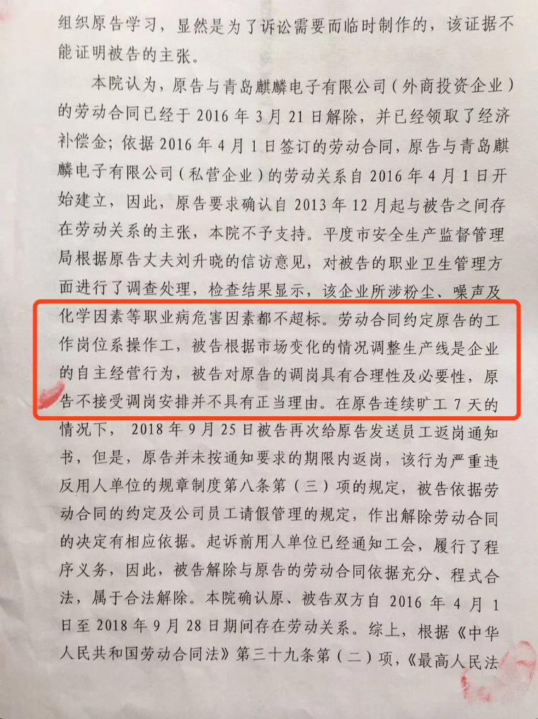不过,平度法院出具的民事判决书显示,2018年9月10日,青岛麒麟电子公司通知李女士调岗,将她从质检岗位调到接触化工胶的车间贴膜作业,李女士不同意调岗。