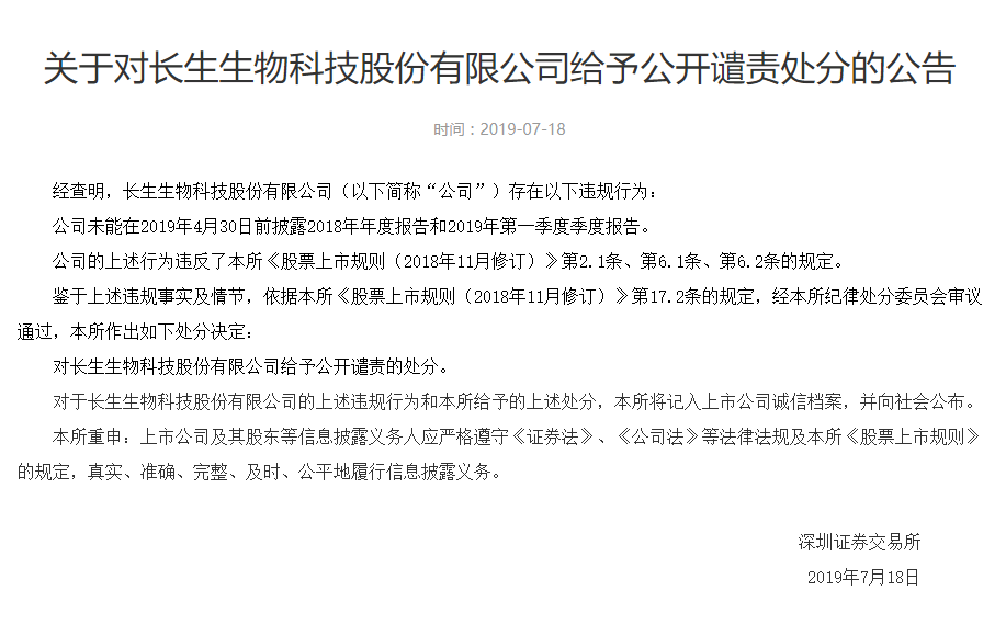 未按规定时间披露年报和季报 深交所公开谴责长生生物