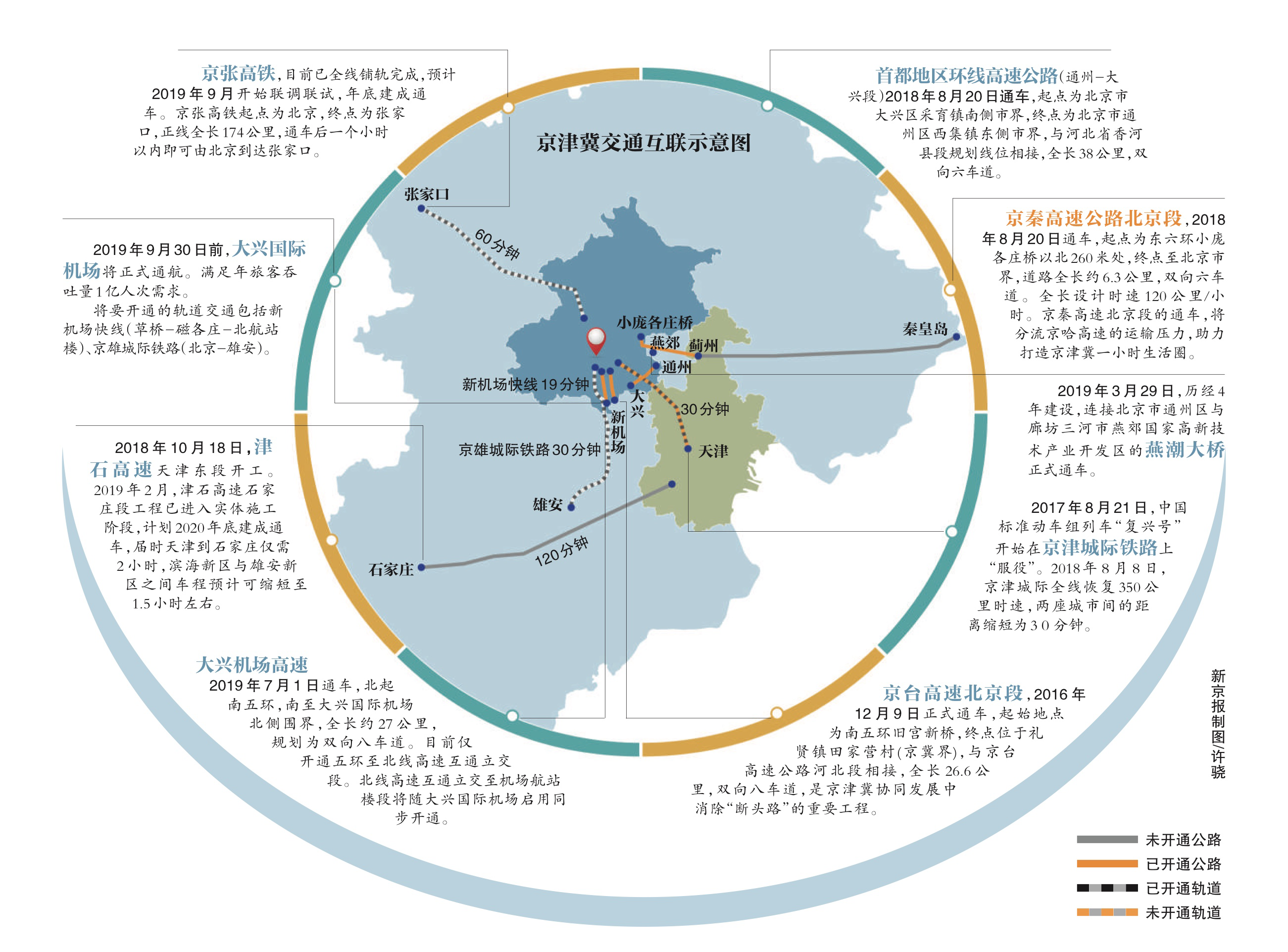 交通网络的完善,不仅是出行方式多样化的表现,更是城市规划建设、区域协同发展过程中重要的一环。新机场的修建、“断头路”的消除、高速公路的开通,在京津冀协同发展上升为重大国家战略五周年以来,三地交通一体化程度不断提高,“京津冀1小时生活圈”逐渐成形。