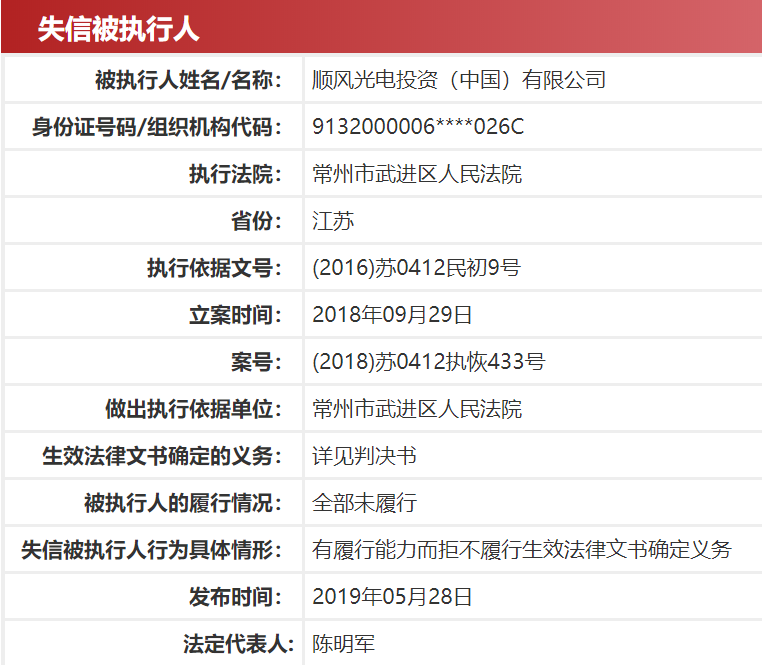中国执行信息公开网今年5月28日发布的信息显示,顺风光电再次被列为失信被执行人,执行法院为江苏常州市武进区人民法院,失信被执行人行为具体情形为“有履行能力而拒不履行生效法律文书确定义务”。