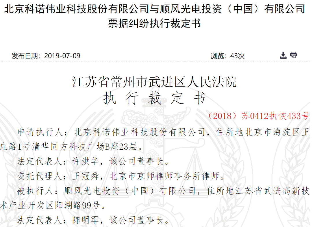 新京报记者获悉,江苏省常州市武进区人民法院6月25日作出的(2018)苏0412执恢433号执行裁定书显示,法院在对顺风光电投资(中国)有限公司(下称“顺风光电”)进行执行过程中,未发现其他可供执行的财产。