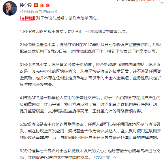 孙宇晨回应质疑:非法集资、洗钱传言均不实