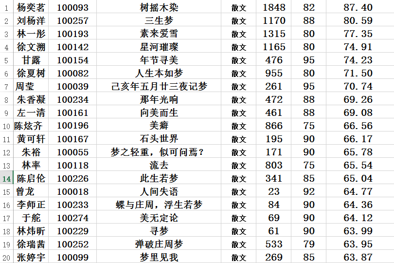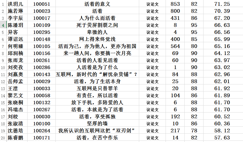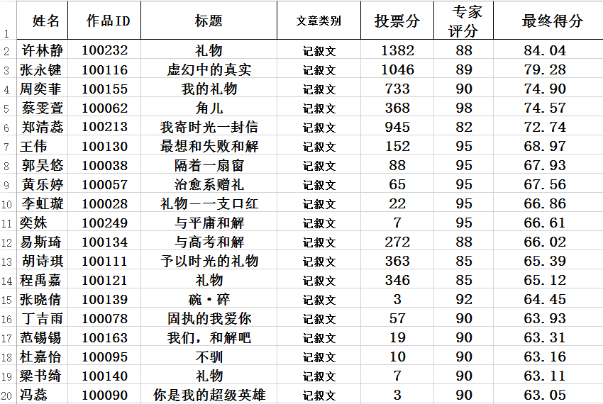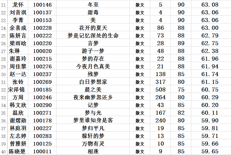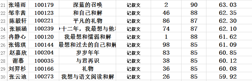 在这一轮评选中,我们最终评出30篇记叙文,40篇散文以及20篇议论文。总计90篇。