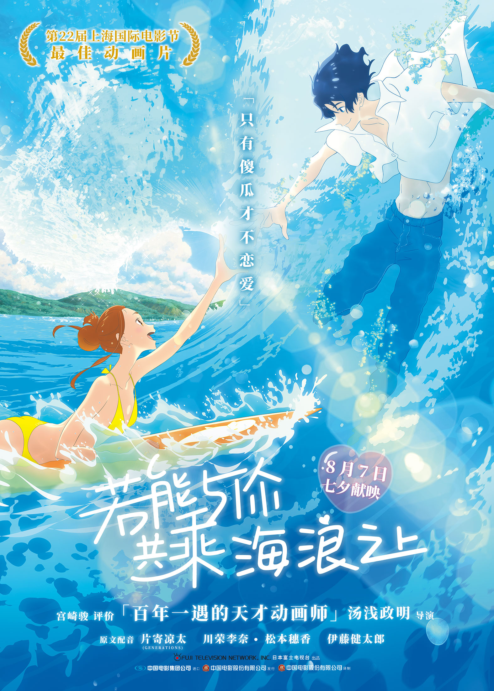 新京报讯 (记者 周慧晓婉)7月23日,第22届上海国际电影节最佳动画片、“鬼才”动画导演汤浅政明全新奇幻爱情力作《若能与你共乘海浪之上》正式定档七夕(8月7日)。影片还一同发布了“甜蜜一夏”版定档预告及定档海报,为这个夏天带来了浓浓的恋爱气息。