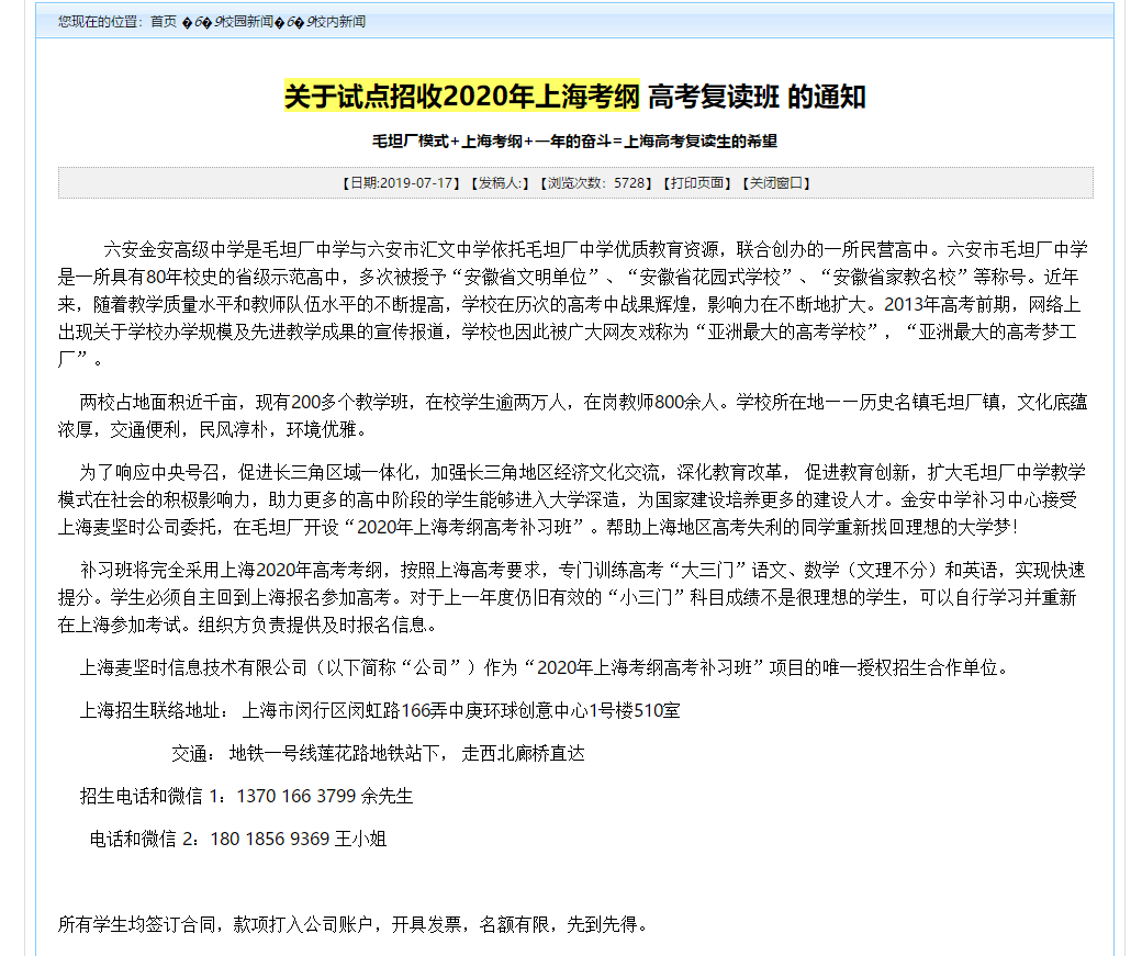 六安金安高级中学官网显示,该中学于今年7月17日发布了一则名为《关于试点招收2020年上海考纲 高考复读班 的通知》的消息,称六安金安高级中学是毛坦厂中学与六安市汇文中学依托毛坦厂中学教育资源,联合创办的一所民营高中。