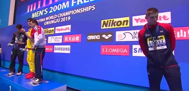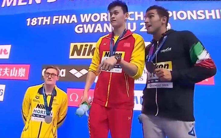 对孙杨来说,在韩国光州举行的2019国际泳联世界锦标赛可谓风波不断。他如愿获得了400米自由泳和200米自由泳金牌,但赛后的回忆并不美好:400米自由泳的颁奖仪式上,获得银牌的澳大利亚名将霍顿拒绝与他同台领奖;200米自由泳颁奖仪式后,铜牌获得者、英国选手斯科特拒绝与他合影。