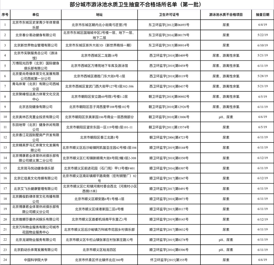 《部分城市游泳场所水质卫生抽查不合格名单(第一批)》中上榜的24家北京泳池。(图片点击可放大)