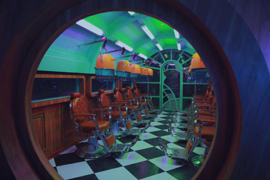 未来一直都带着过去的味道。橘色的椅子,深橘色的门框,黑白格子的地板,散发着绿蓝荧光的屋顶,整个空间都散发着上世纪80年代的气息,这里是未来的理发店。在未来世界,理发店可能不再是修理发型的地方,而是人们的心理修护站。踏入这个空间,拉下头盔你可以搜索到别人的故事,也可以搜索自己的过去,通过这种方式缝补心中的那些遗憾。