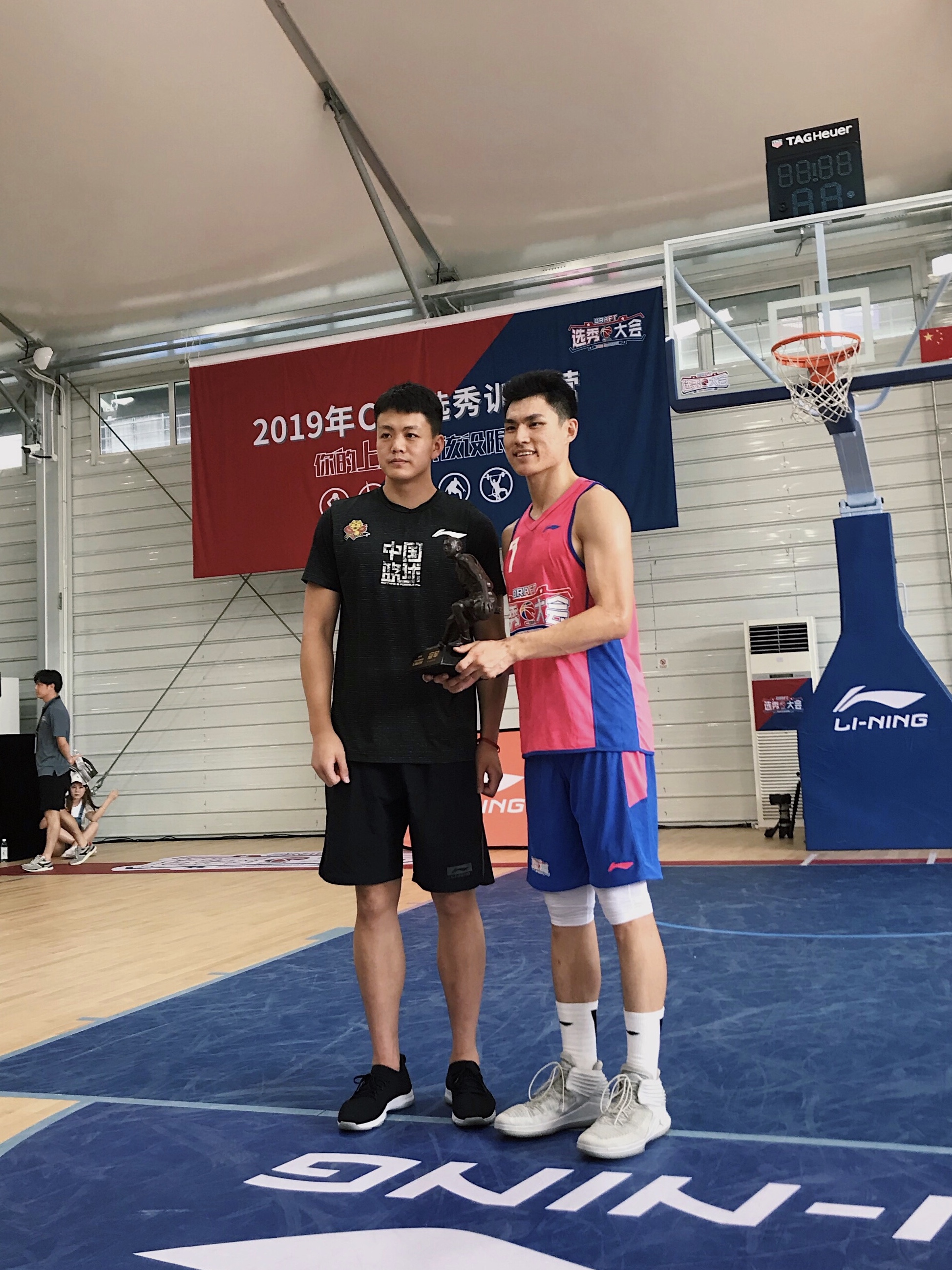 今年CBA选秀与著名民间赛事“路人王”合作举办了1v1挑战赛,32名选手报名参加,张梓祎去年北京站7战全胜。今天,他经过前4场争夺跻身决赛,面对来自台湾宝岛梦想家的郑玮,率先完成7分钟内得11分的任务,成为首届CBA选秀训练营“单挑王”。去年“状元秀”姜宇星为他颁奖。