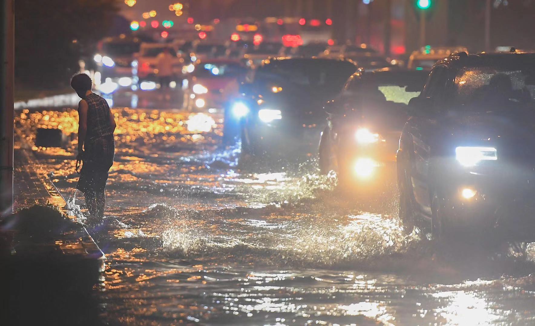 新京报记者在金台路与朝阳北路交叉口看到,周边路段有雨水向这里汇聚,道路中间已成一片“海”,漫上人行道,不少行人蹚水通过。水最深处路段没过车轮,有车通过时,掀起巨大水浪。由于通行困难,道路一度出现拥堵。