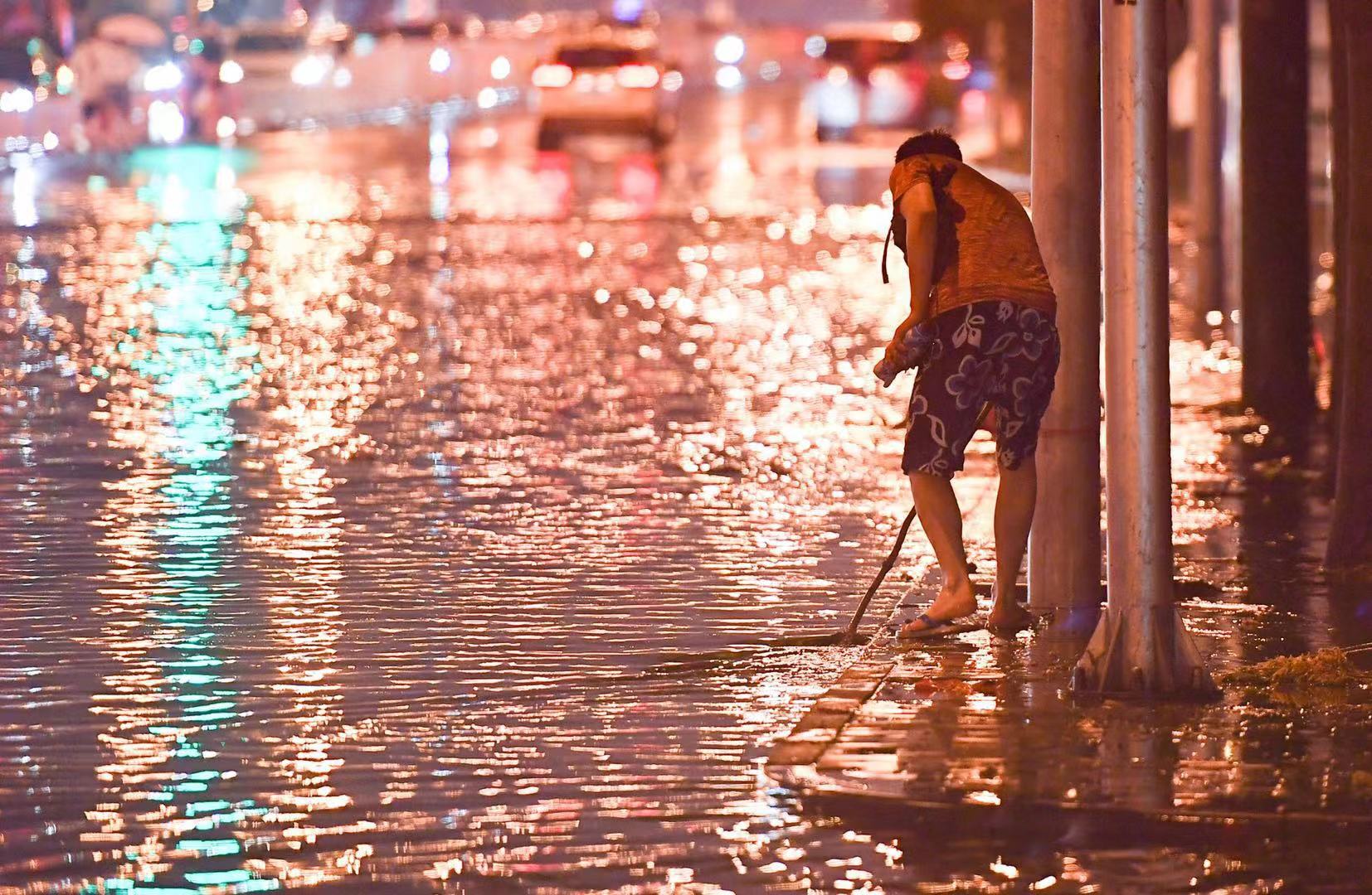 21时许,多名排水抢险人员到达现场处置。工作人员将排水井盖撬开,以排走积水。